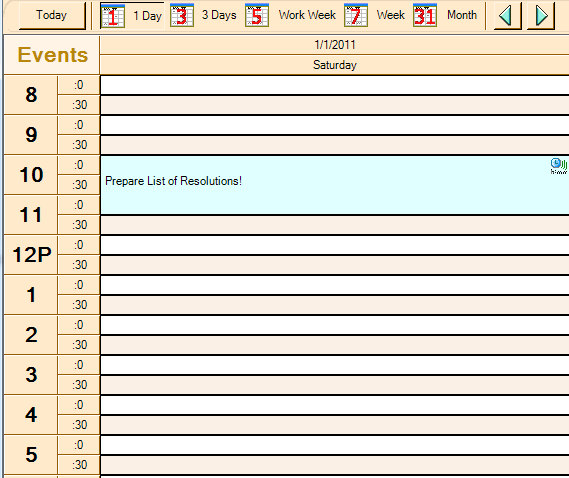 Calendar View allows you to see at a glimpse those events that you have scheduled for various periods of time. It has several views based on the length of the period that you wish to view and your Calendar Preferences. The possible calendar time periods are represented by “sticky” toolbar buttons as follows: