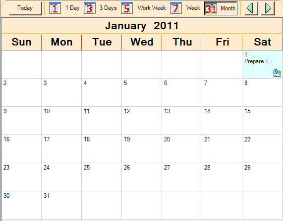 Below we present two of the views for the Calendar feature. Each view represents one of the 5 possible snapshots of your calendar. You enter Calendar View either by using the main menu View > Calendar or pressing the icon.