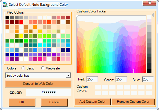 To save a color for your use anywhere in NoteMagician, select a “blank” (white) custom color cell and press Add Custom Color to save that color. |