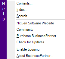 - Information about this software version as well as some statistics about item counts. The table below list the options on the Help Men