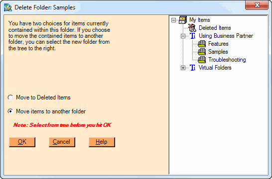 When you choose this option, you will be required to select the target folder for the notes contained in the topic or folder you are deleting. Choose that target folder from the tree to the right of this dialog. |