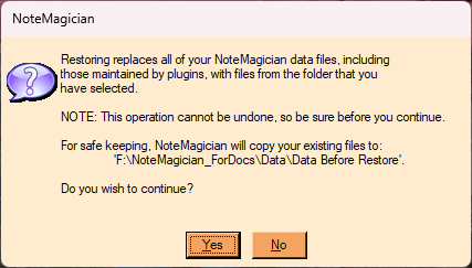 If you choose Yes to continue, your NoteMagician database files will be overwritten with those from the backup folder and your restored preferences will be used. Before doing the restore operation, your old data files will be move to a “NoteMagician Before Restore” folder as shown in the above dialog.