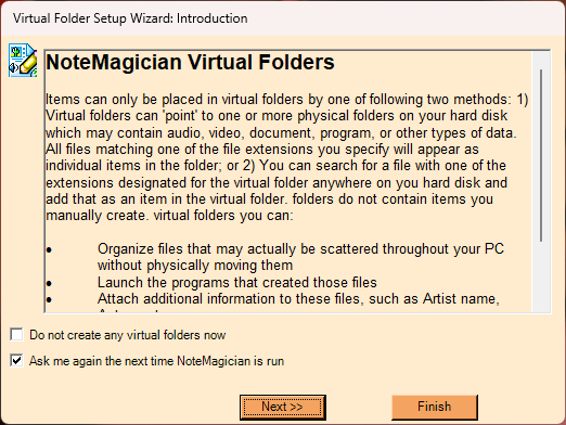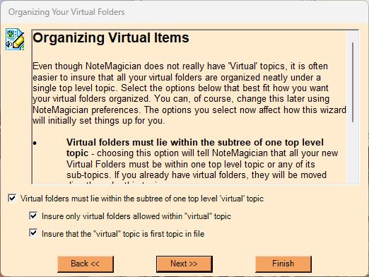 NoteMagician provides a handy wizard to help you set up virtual topics and folders. This wizard will appear the first time you run NoteMagician after installation or upgrading, or can be run from the virtual preferences screen under Edit > Preferences.