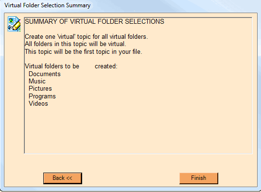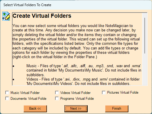 The final selections will allow you to set up the most common types of virtual folders. These folders will be set up to automatically synchronize some basic file types from the common Windows location for these file types. For example, the “Music Virtual Folder” will be assigned to create virtual items for most music file types contained in your “My Documents\My Music” folder. Through Virtual Preferences you can change the Windows’ folders associated with any virtual folder, as well as which files (by file extension) are to be included.