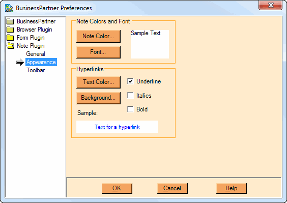 This button lets you select the default background color for note items. NOTE: Please be aware that if you choose a non-white background for note items, you may want to set the Note Plugin General Preference to force white background on printing. Otherwise, you will likely waste ink on a color printer. |