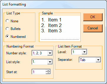 Choose the basic type of list from None, Bullets and Numbered. What you choose may reveal different options elsewhere in this dialog.. |