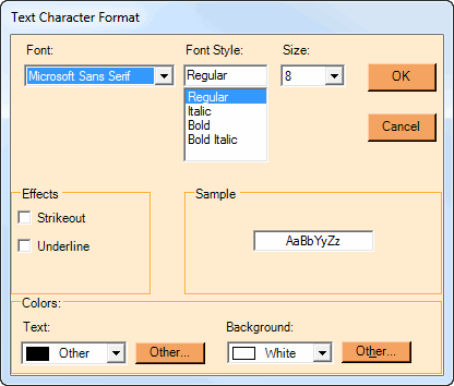 Presents a dialog where you can set the font, style and size of the text for the selected text. If no text is selected, then subsequent text entered at the cursor position will have these attributes. |