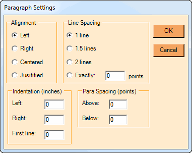 Paragraph formatting affects the paragraph where the current cursor position sits. The paragraph formatting dialog appears below. Following is a table outlining the options on that dialog.