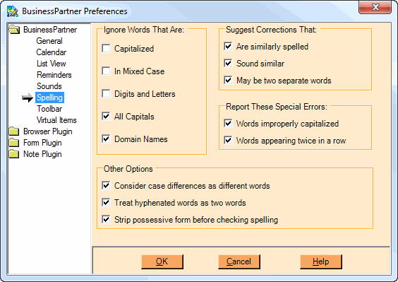 These options determine how the spelling checker operates. Currently, spell checking is only available for the Note Plugin. The fields above are described in the table below: